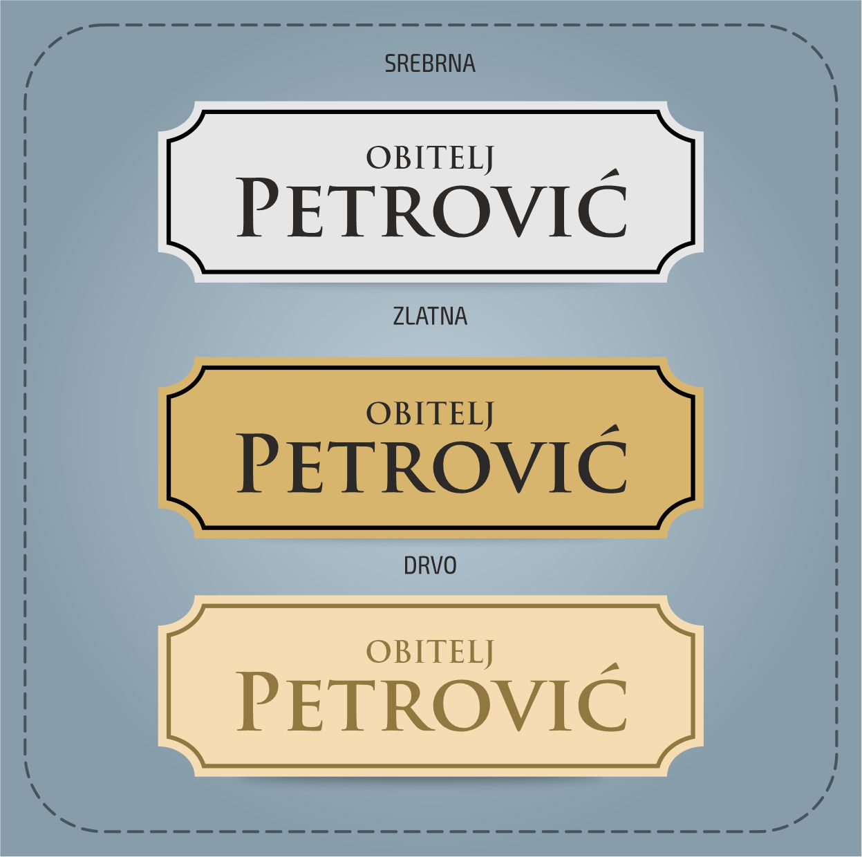 Kada je u pitanju uređenje prostora, malo detalja može napraviti veliku razliku. Jedan od tih detalja su i natpisne pločice za vrata sa prezimenima koje mi proizvodimo u srebrnoj i zlatnoj boji.